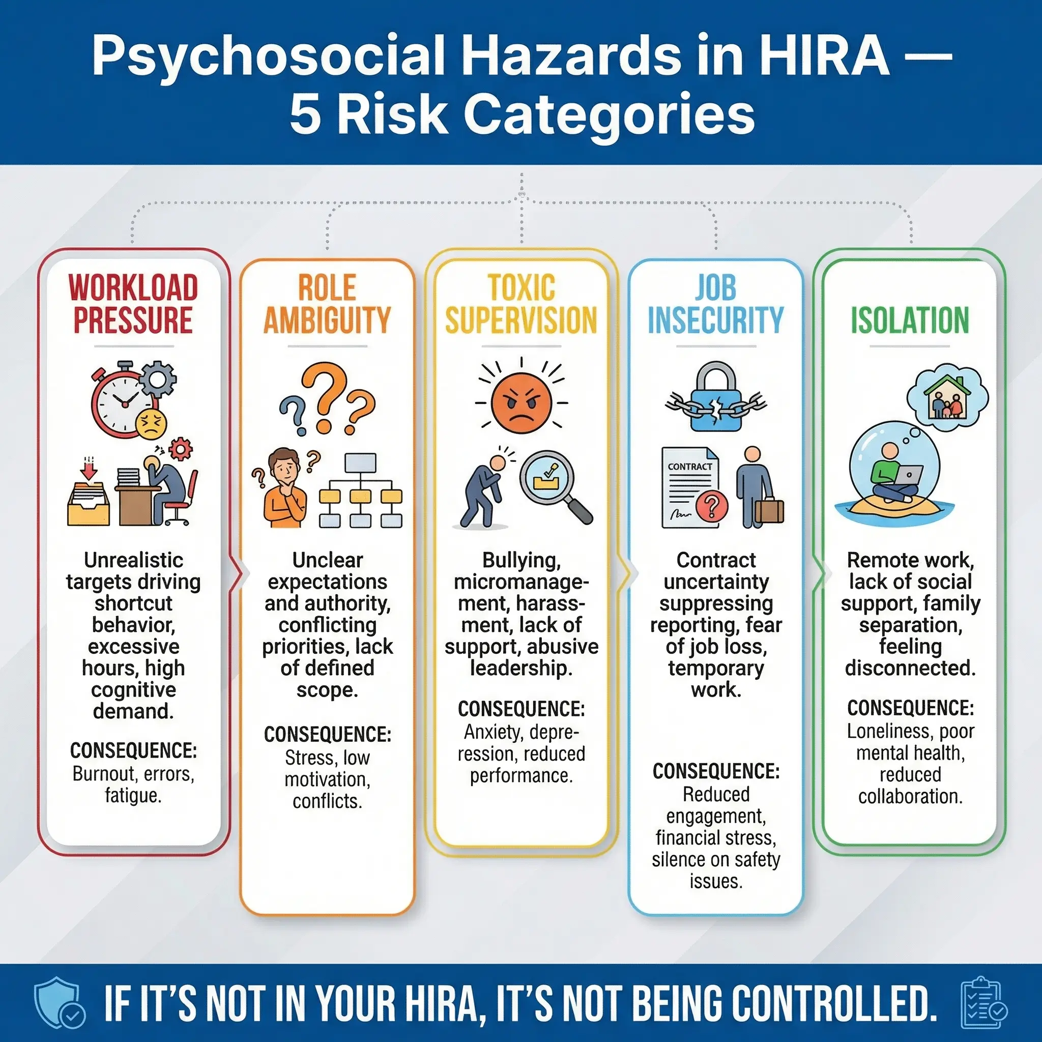 Most organizations conduct thorough Hazard Identification and Risk Assessment for physical hazards — fall from height, chemical exposure, struck-by incidents — but completely ignore psychosocial hazards. The result is a HIRA register that covers half the risk landscape and leaves the other half invisible. I have audited dozens of management systems where the risk register contained 200+ physical hazards and zero psychosocial entries. That is a system gap, not an oversight.