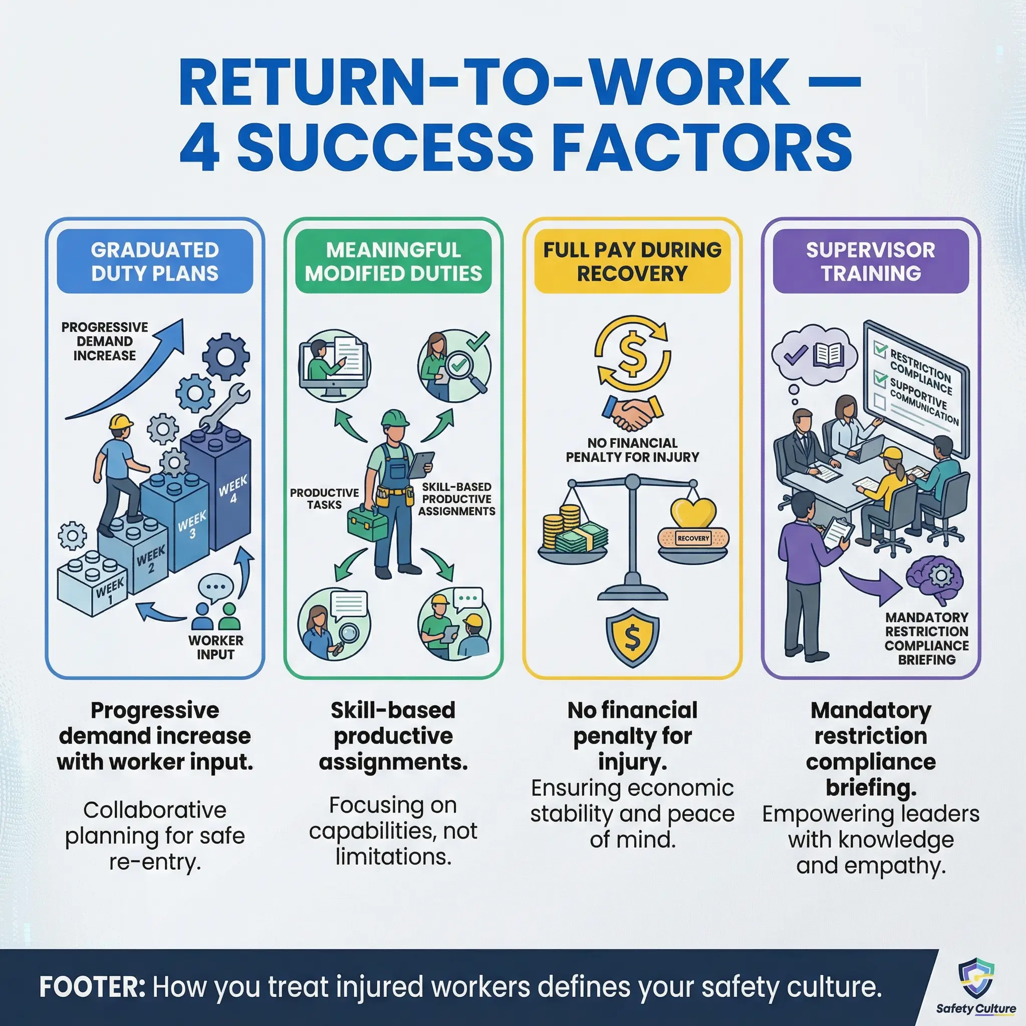 - No financial penalty during recovery. Workers who lose income during return-to-work phases learn that getting injured has financial consequences — and the next time, they will hide the injury. Full pay during graduated return is a safety investment, not a cost.