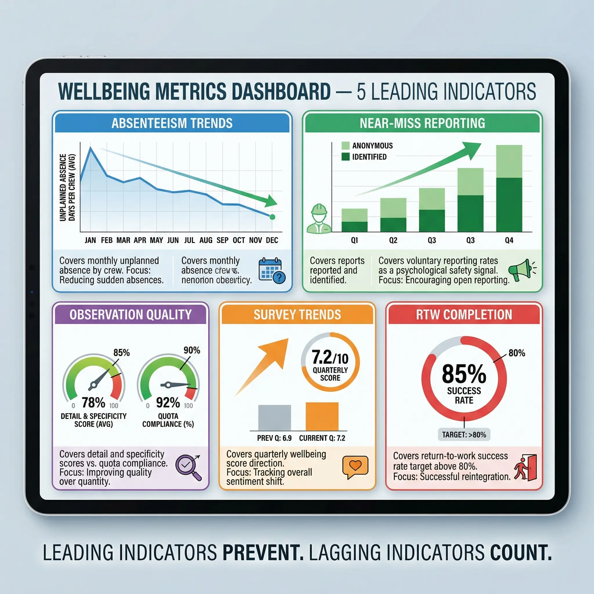 You cannot manage what you do not measure, and wellbeing is no exception. The challenge is that traditional safety metrics — TRIR, LTIFR, DART — are lagging indicators that tell you about failures after they happen. Wellbeing measurement requires leading indicators that signal risk before incidents occur.