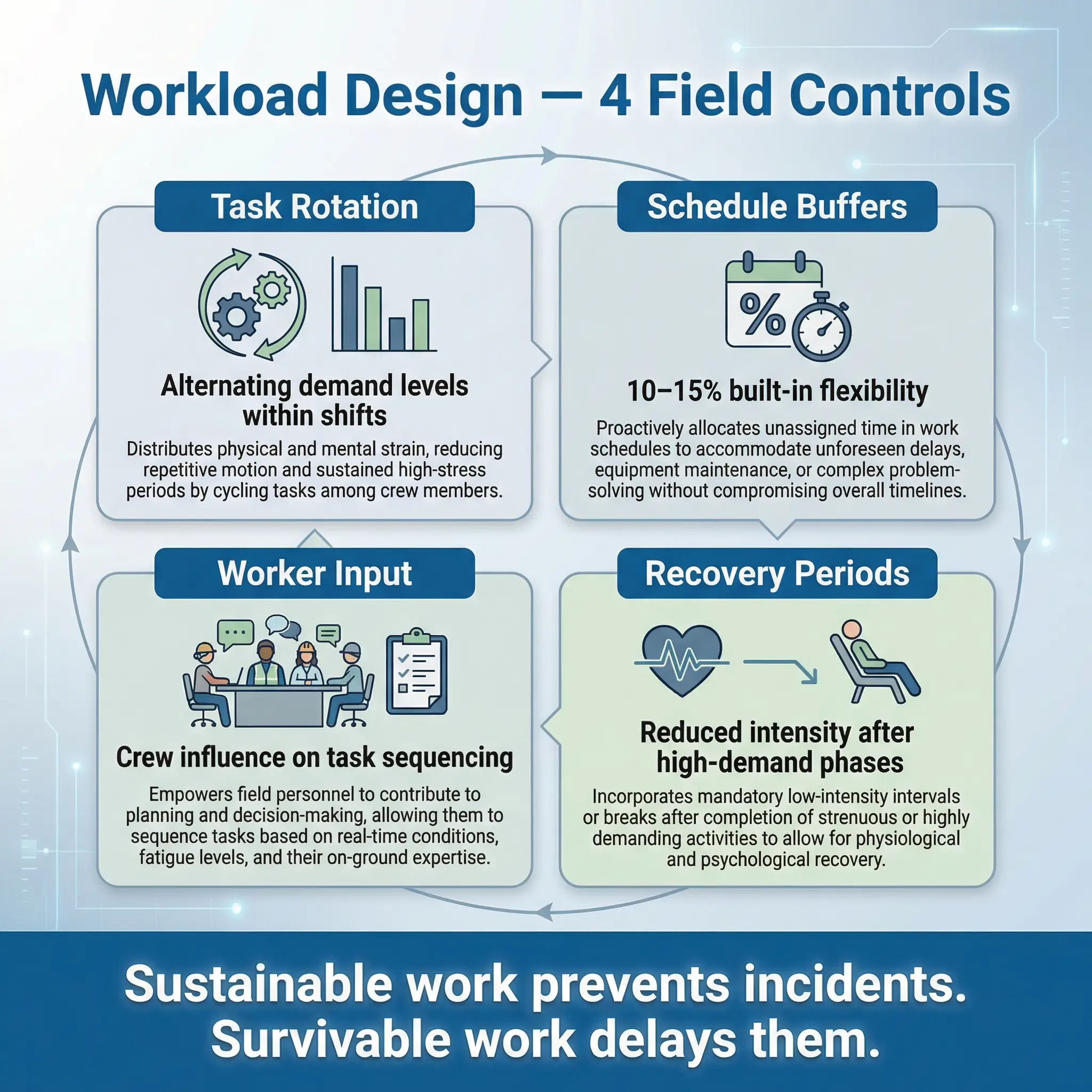 This is the initiative that most organizations skip because it requires them to challenge production assumptions. Workload design means deliberately structuring job demands, task variety, autonomy, and recovery time so that work is sustainable over the duration of a project or rotation — not just survivable.