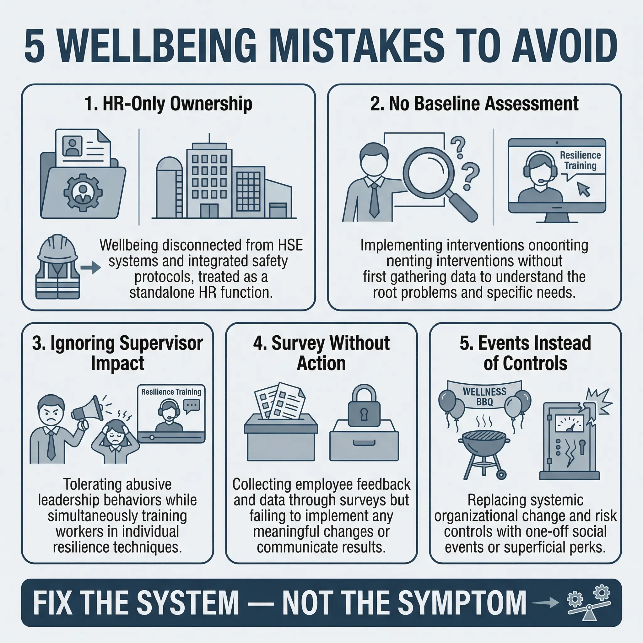 - Launching programs without baseline assessment: Organizations implement wellbeing initiatives — yoga classes, mental health apps, wellness days — without first understanding what the actual problems are. A fruit basket does not fix a 70-hour work week. Assess first, then intervene based on evidence.