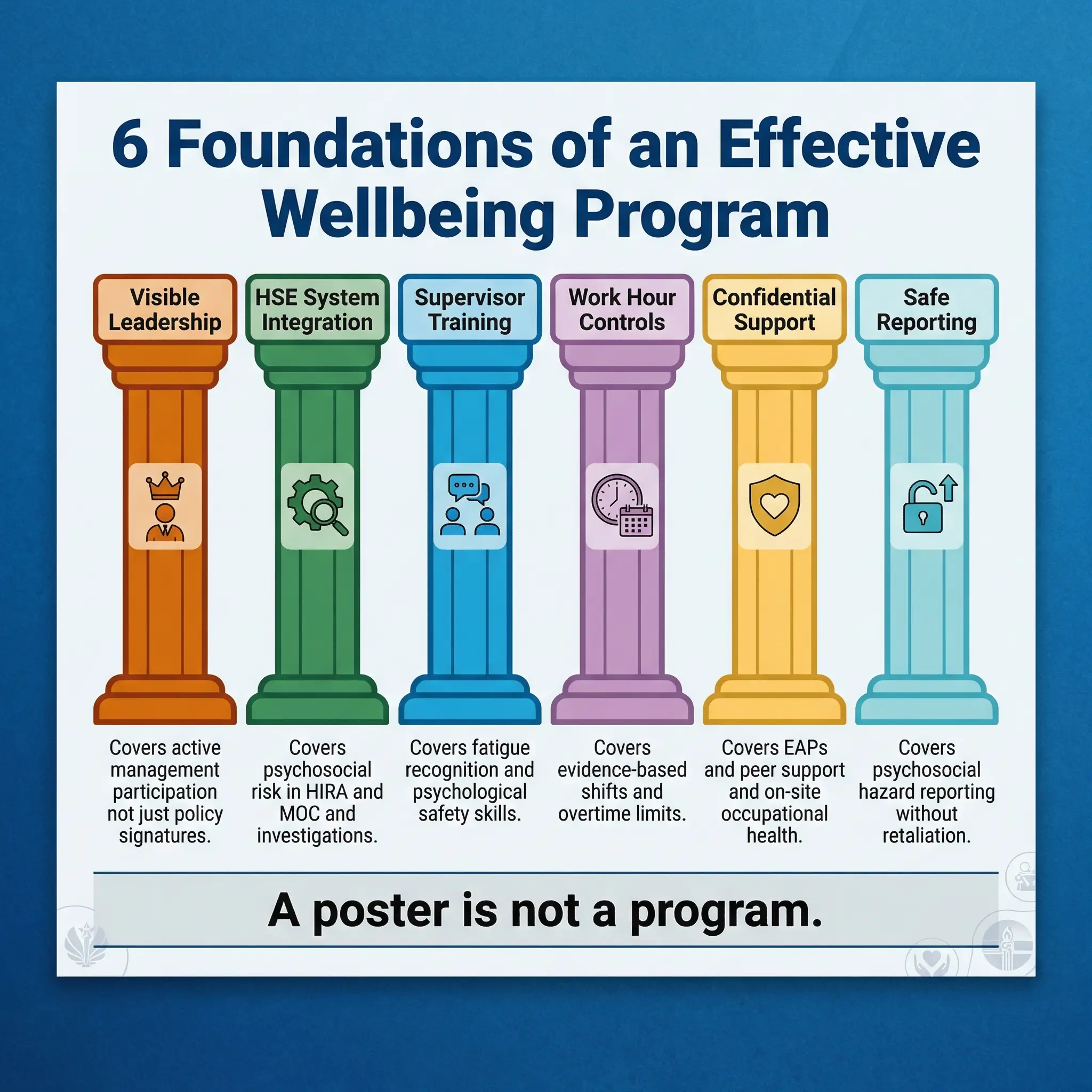 - Implementation starts with honest assessment: Walk the site, talk to workers, review absence data, and treat wellbeing with the same rigor you apply to chemical exposure or fall protection.