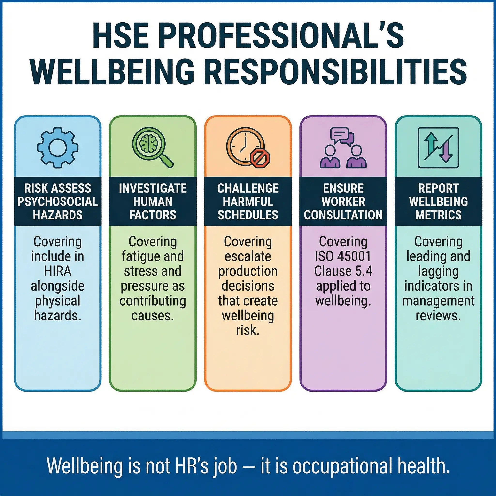 What changes with an explicit wellbeing focus is not the scope of the role, but the tools and attention required. The following responsibilities sit squarely within the HSE professional’s domain: