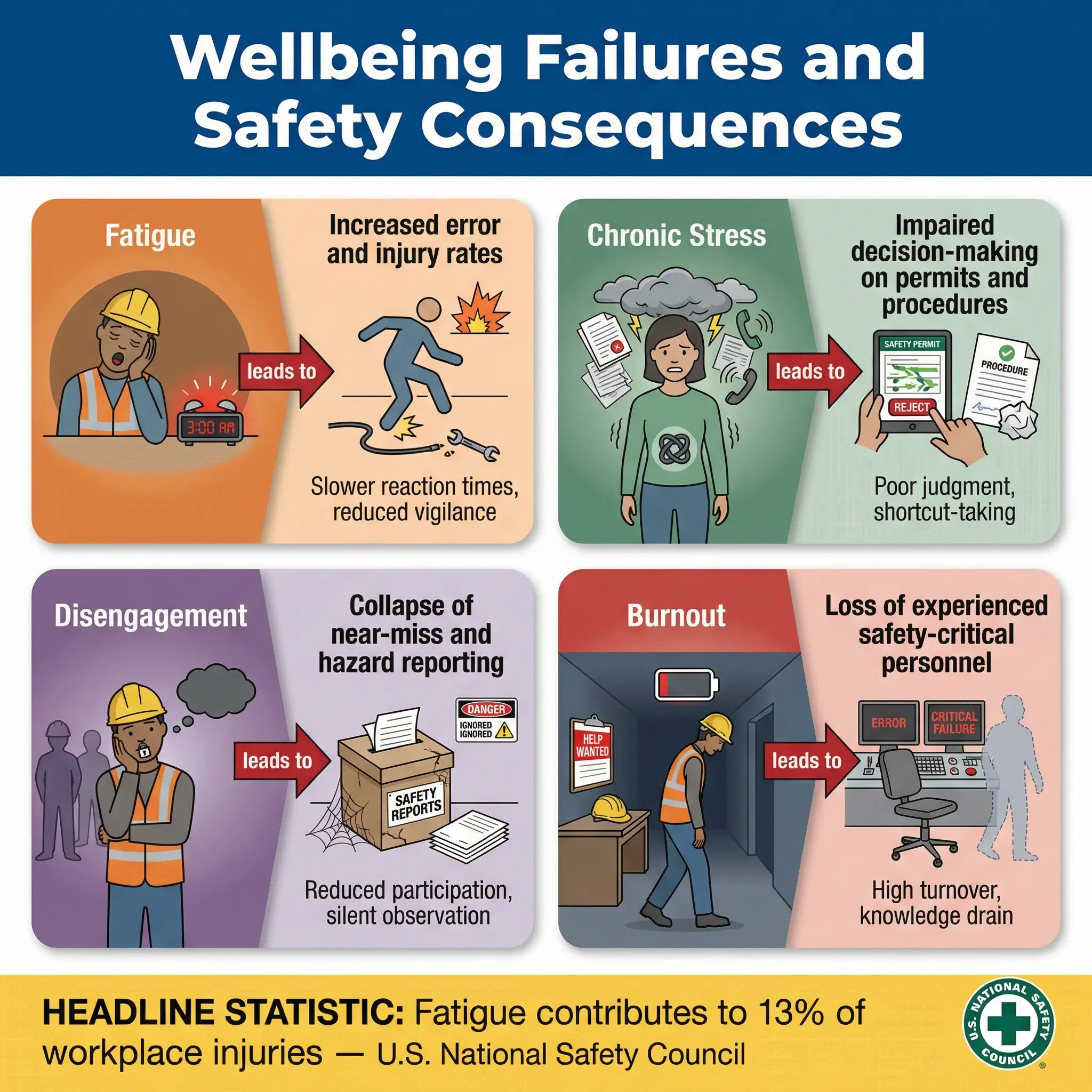 The relationship between worker wellbeing and safety outcomes is not theoretical. It has been documented across industries and confirmed by both regulatory agencies and independent research. The following connections appear consistently in incident investigation data and epidemiological studies: