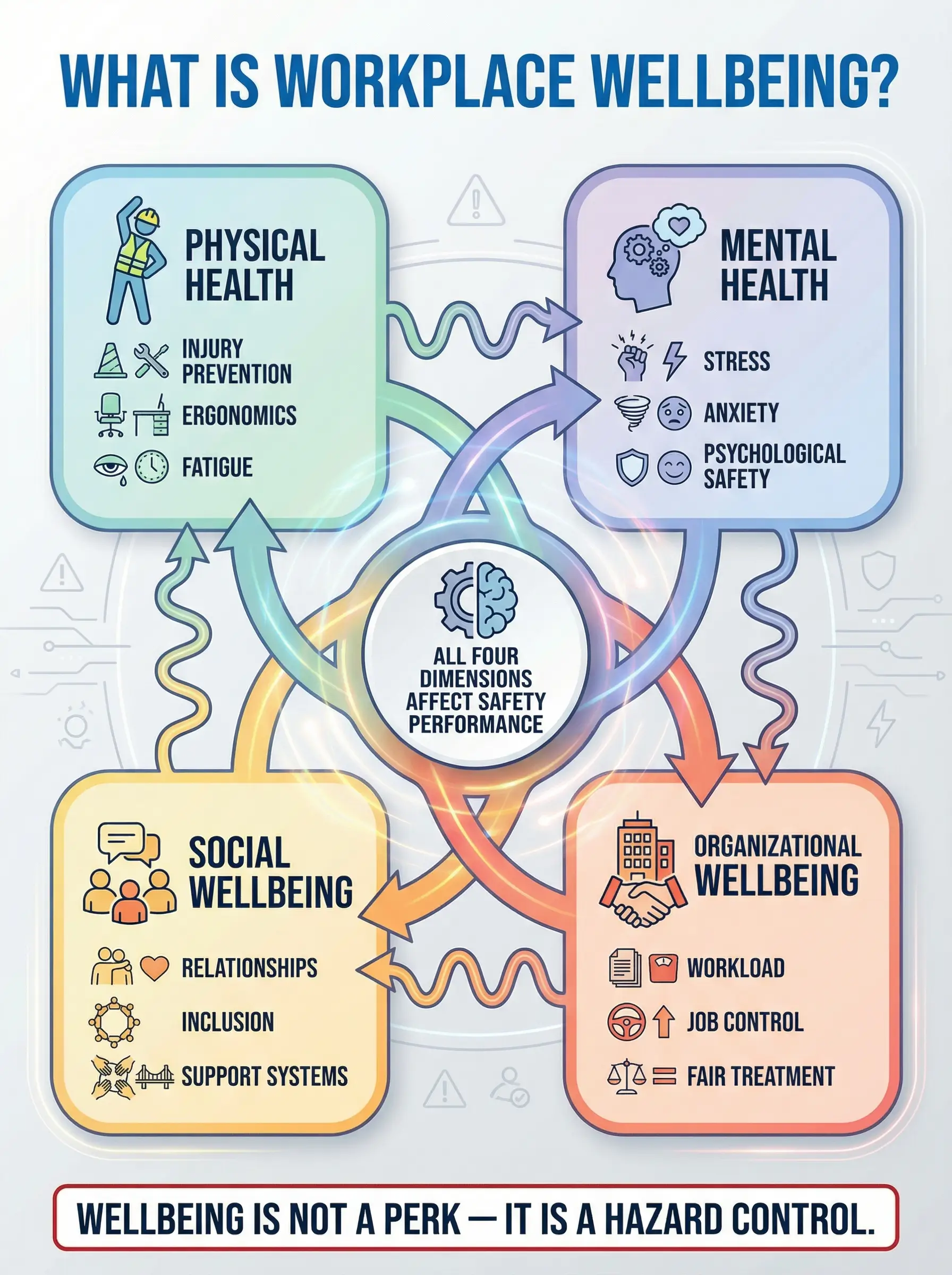 - Workplace wellbeing is more than a wellness program: It covers the physical, mental, social, and organizational conditions that affect how workers feel, function, and stay safe on the job — and it belongs squarely within HSE management.